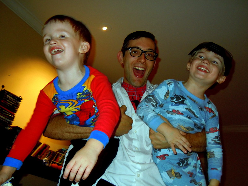 Upon sunset we took Shareen's three year old nephews trick-or-treating. They were twins and completely obsessed with Marvel Comics. They dressed as Iron Man and War Machine and I was introduced to them as Peter Parker. Adorably, they wouldn't leave me alone and we entered epic comic book battles with imaginary laser guns and lots of web slinging. Though it was terribly fun, I don't have a lot of experience playing with kids and I had a tough time fighting the urge to pat them on the head and shake them by their scruff as if I were playing with dogs.