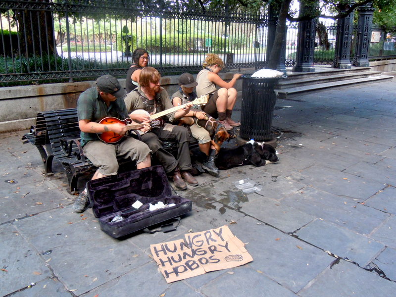 New Orleans seems to be a city much less concerned with distinctions. Streets and sidewalks seem a free-for-all for cars, bicycles, and pedestrians; androgyny and drag queens and kings are common; and the lines between even business people and the homeless can be difficult to determine. It was even tricky to discern whether someone was in costume for Halloween or if that's merely how they were -- something that become increasingly clear in the days following (as many of the costumes never came off). The young bohemians adhere to a dress code: dark brown and tan tones, thick boots, facial tattoos, brightly colored hair, and costume hats. Known as "grunge kids" or "gutter punks," they play music and panhandle, but I'd heard other locals complain that some of these kids live in nicer apartments than they do and even make sizable withdrawals at the ATM. I guess being homeless is a lot easier when mommy and daddy are bankrolling the endeavor.