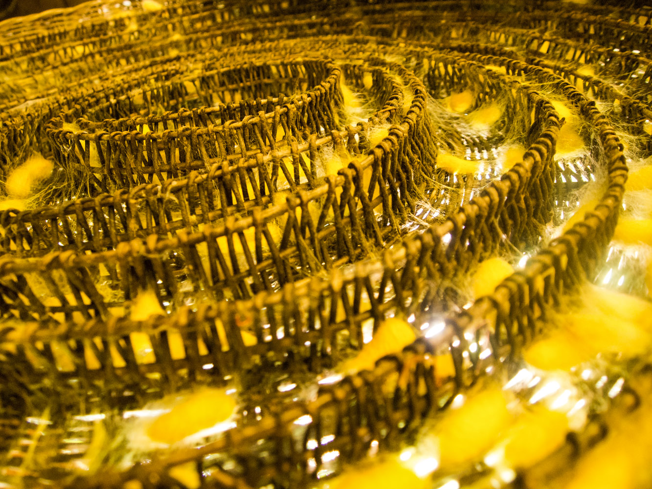 is then dyed, dried, and woven through complex bamboo looms into intricate