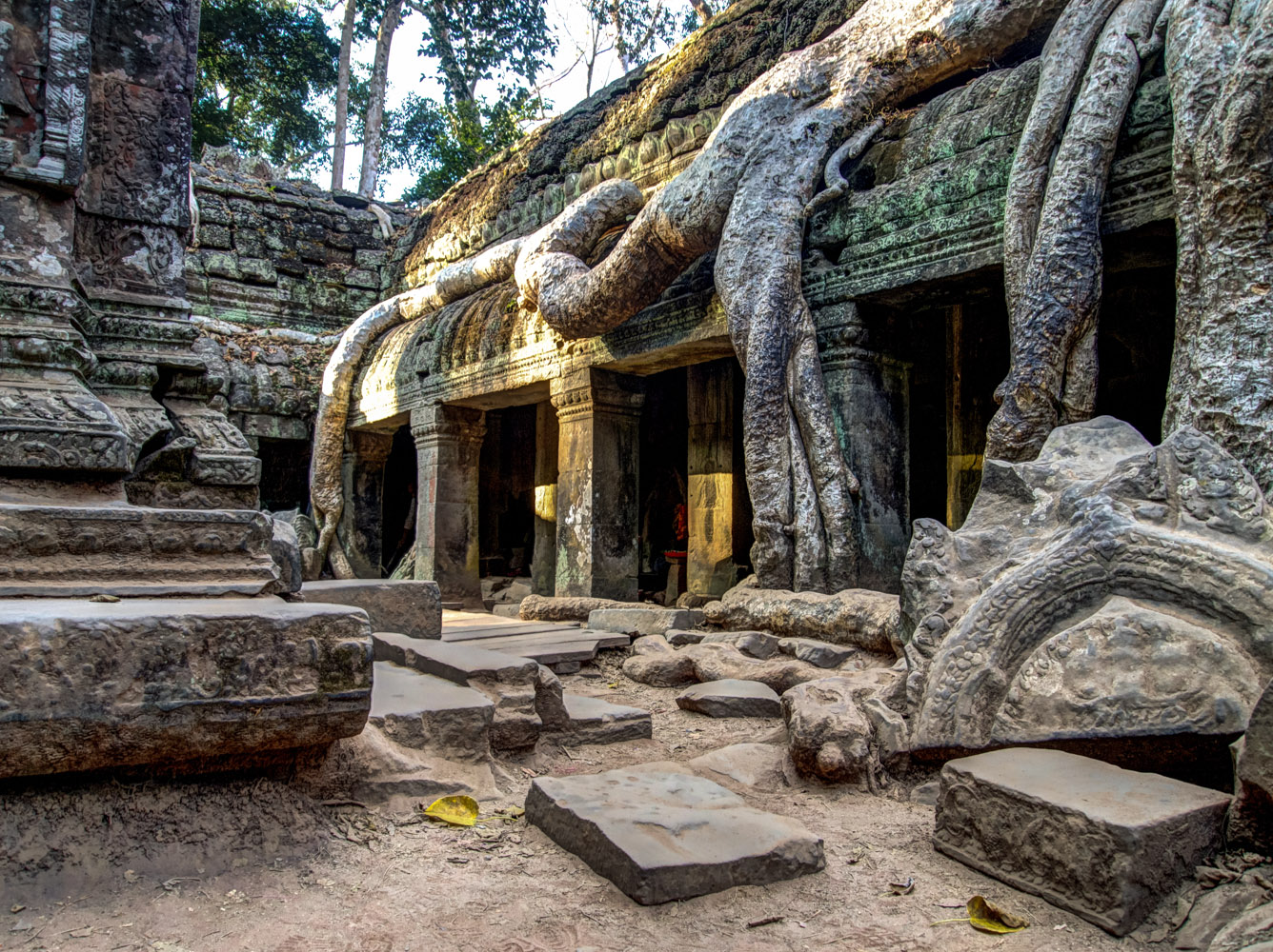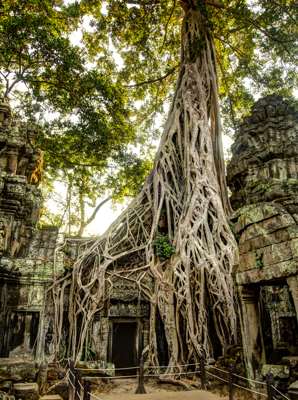 the might of nature over the triumphs of man, huge trees erupt from the temple