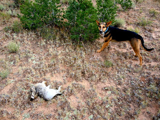 Erin and Patrick had adopted one of the countless stray dogs which hover around the streets of Thoreau looking for scraps, a handsome and energetic puppy they named Razz. We took him for a hike in neighboring canyon, where he teased a rabbit out of a bush and left it nearly dead and panting wide-eyed. I scurried to find a rock and put it out of its misery.