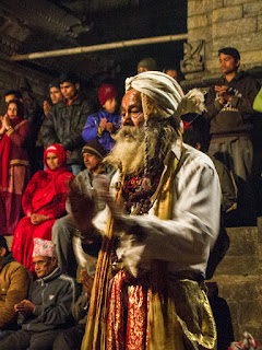 a series of brightly robed dancers performed in unison with large fans. Next to them, a delightfully crusty old Sadhu